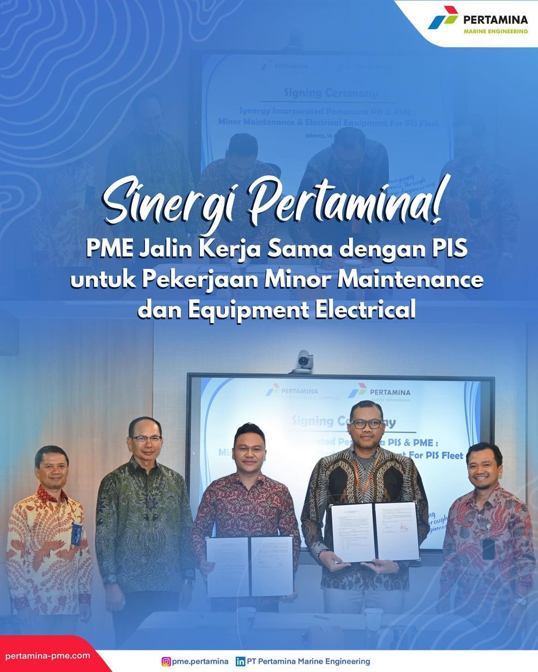 PT Pertamina Marine Engineering (PME) resmi menjalin kerja sama dengan Sub Holding Integrated Marine Logistic (SH IML), PT Pertamina International Shipping yang berlangsung di Oil Centre Building Jakarta Pusat. Kerjasama ini dibangun sebagai bentuk synergy incorporate di dalam Pertamina Grup yang mencakup penyediaan Jasa Material Minor Maintenance serta Material Electrical & Electronic equipment untuk kapal-kapal milik PIS.